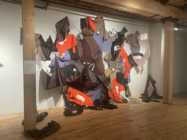 Through my studio process of reclaiming & upcycling materials, I reconstructed this work from previously thrifted articles of clothing. This installation was originally created for the group exhibition S.O.S, at the Bridgeport At Center in 2010. Over the past year, I expanded Deepwater Horizon; Suppuration’s discourse, palette, materials and scale for the current exhibition: Environment/s/tallation. The only new material purchased for this work was Dawn dish soap that I used to scent and tint white button down, collared & cuffed shirts to a pale blue hue. I chose the Dawn dish soap as a liquid material element for the installation because it was the soap used to clean the oil soaked animals who suffered from this disaster. Needless to say, I am still conflicted about purchasing a plastic bottle for this project.